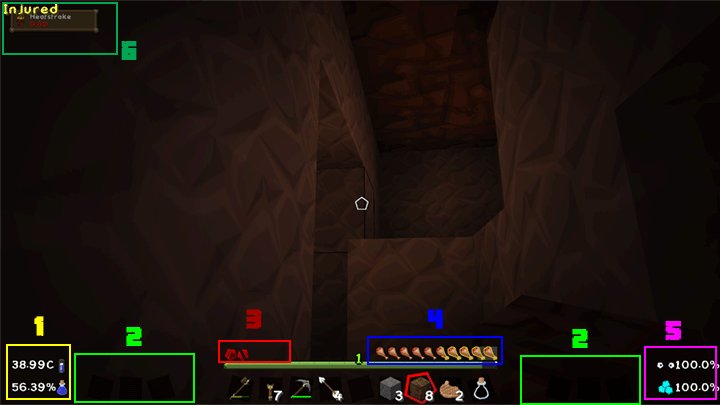 6. Status Effects:Several mods give notifications of status effects, from Heatstroke to simply announcing when you are Injured or Dying. Most of these notifications have been customized to show on the top left of the screen. Pay attention to that area.